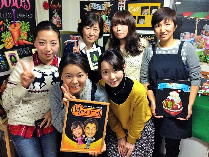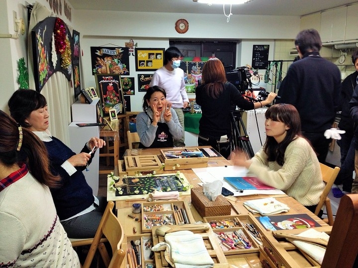 実は、チョークのレッスン帰り、生徒さんがアトリエ近くを歩いていたら たまたま平針を取材に来ていた長島アナウンサーと取材班が生徒さんたちに声をかけ、平針名物を聞かれました。その時に、チョークアートの話を出してくださり、教室を見てみたいということで生徒さんが取材班をアトリエに連れてきてくれたのです!!